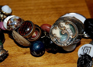 A string of approximately 315 antique and vintage buttons tied in a loop purchased May 15, 2015 Wichita, KS. The buttons are mostly small to diminutive in size but there are some medium and a couple large size buttons on the string as well. The touch button is a brass woman’s head followed by a green and cream celluloid set in brass, a Deknatel black glass castle button, a clambroth glass set in brass button, then white glass, black glass, vegetable ivory ball, brass with black glass center, composition ball with silver inlay design, brass with celluloid insets, 2-3 different caramel Victorian glass buttons, small brass buttons with painted designs and cut steels, paperweights, carved MOP, original blue tint on brass, milk glass Jenny Lind waistcoat, faceted luster ball, precision inlay star-shaped mirror set in black glass, fabric set in brass, imitation fabric black glass spindle, Poppers in all shapes and colors, foil in glass, pink glass oval with white cameo head, waistcoats, charmstring glass, yellow and blue glass, dimi brass with paste, abalone, metal with black stripes, black glass with gold design, metal with abalone, multicolored molded glass, 7-8 small enamels, brass with four pastes inset, clear glass, lavender glass, MOP set in brass, painted brass, medium woven fabric in a stamped brass border, turquoise Victorian glass, reverse painted, brass ball, small brass picture button of chariot with self shank, Czech/Bohemian glass, metal with glass inset diamond shaped, spindle possibly Venetian glass?, Radiant, dewdrop, small paperweight with rose, prong set pastes in metal– 7 stones, glass cat eye with thin wire shank, tiny teddy bear eye with thin wire shank, dimi brass shaped, matte black glass, various tiny glass beads and metal charms including an anchor, yellow slag glass, molded glass in brass drum, 1904 metal teddy bear button with blue background, black glass with silver luster crescent moon, black cone with tip glass tip, enamel with roses with red pastes border, steel ball, white Victorian glass, glass set in brass,, black glass with enamel, white metal knot, brass with MOP inset, blue enamel spindle, brass with gold stone disk, black glass with blue luster, ruby glass with design, Aristocrat, milk glass dome, enameled hexagn with turquoise bead border, kaleidoscope with black and white design, brass coin button, small metals, small brass wth glass, large painted brass, lithograph of St Bernard dog head in gold drum.